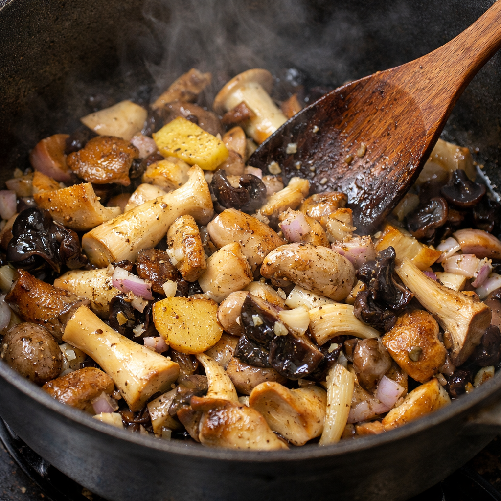 Add Shallot, ginger, Sauté until fragrant and lightly softened.Add mushrooms and sweat