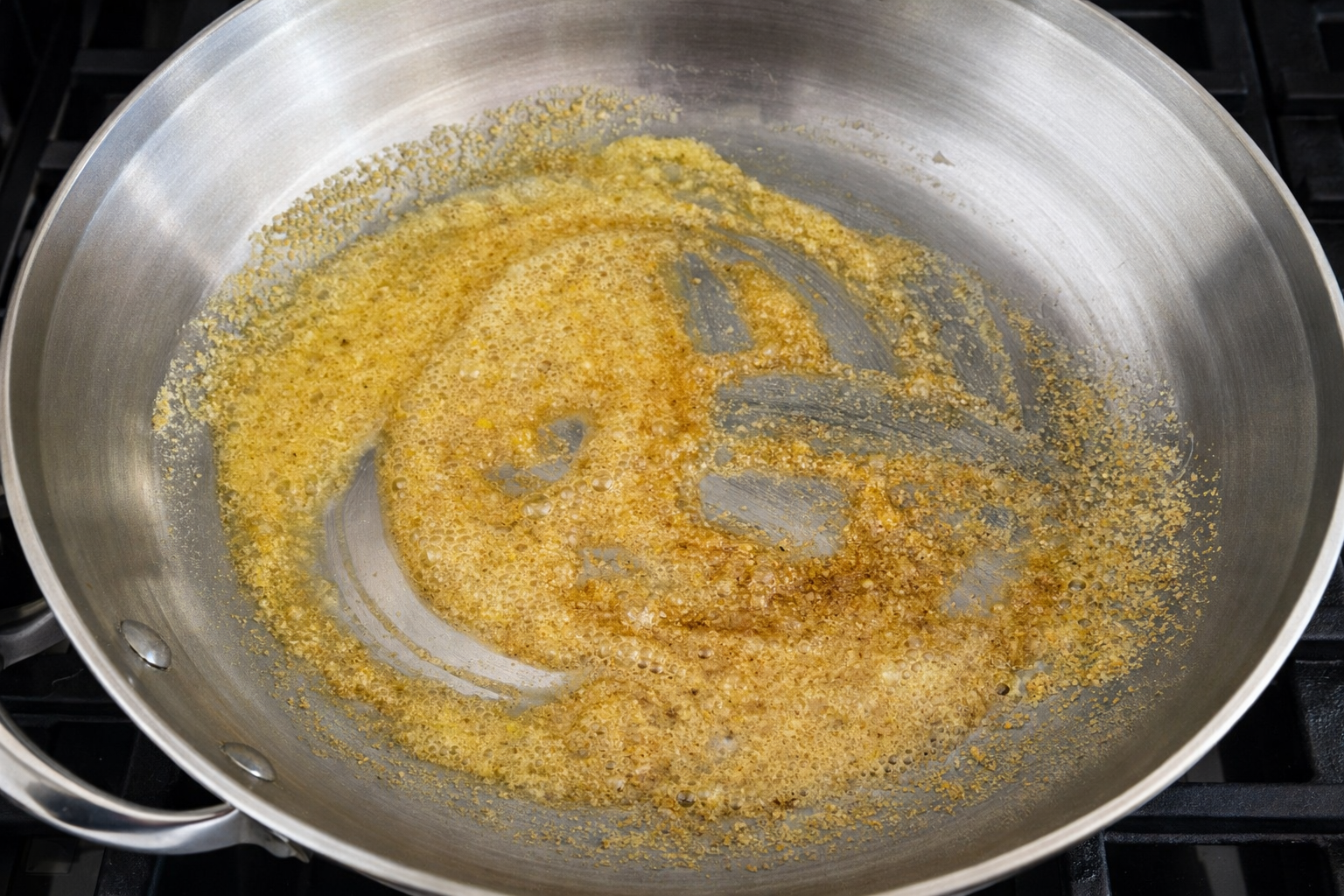 Add pistachio flour to the pan. Stir constantly until it changes from light green to a light golden color.(This step builds nutty depth — watch carefully.)