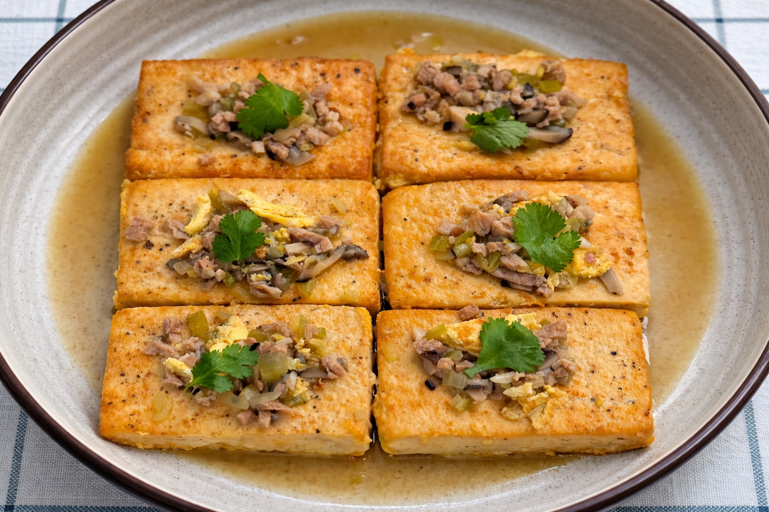 Golden-seared tofu in a light, savory sauce with mushrooms, ginger, and aromatic vegetables—simple, nourishing, and comforting. A versatile dish finished with fresh herbs and perfect for a wholesome meal.